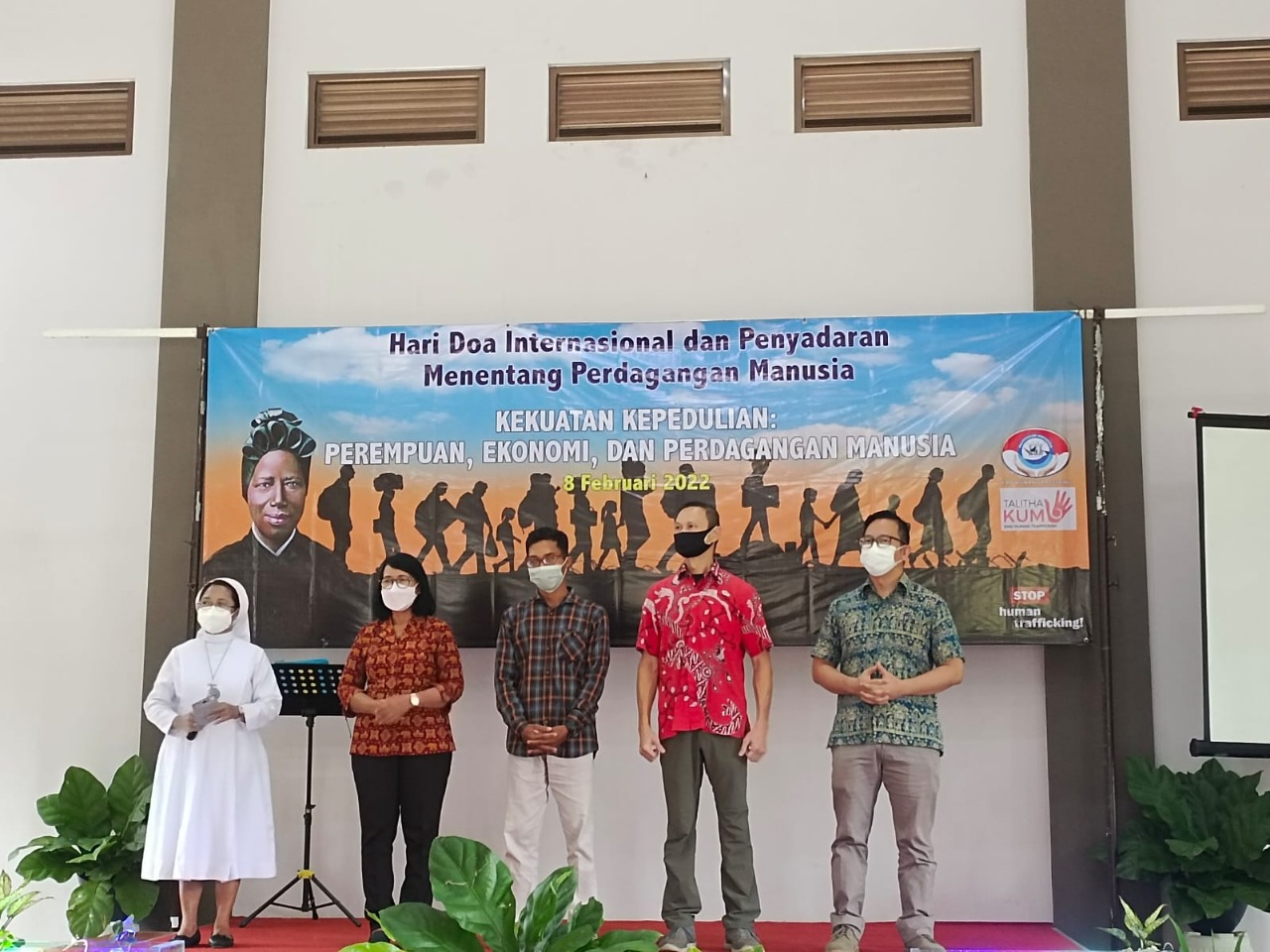 Kegiatan dihadiri oleh komponen masyarakat lintas iman khususnya yang peduli terhadap korban perdagangan manusia, dengan pemantik diskusi Suzana Indriyati Caturiani, akademisi, dosen FISIP Universitas Lampung dan Tymu Irawan dari Serikat Buruh Migran Indonesia (SBMI) Lampung dengan moderator diskusi Yuli Nugrahani, Ketua KKPPMP Keuskupan Tanjungkarang. Dalam kegiatan ini seluruh peserta menjadi narasumber yang menambahkan data, masalah-masalah dan juga peluang-peluang aksi yang sudah dan bisa dikerjakan untuk menghentikan perdagangan orang.