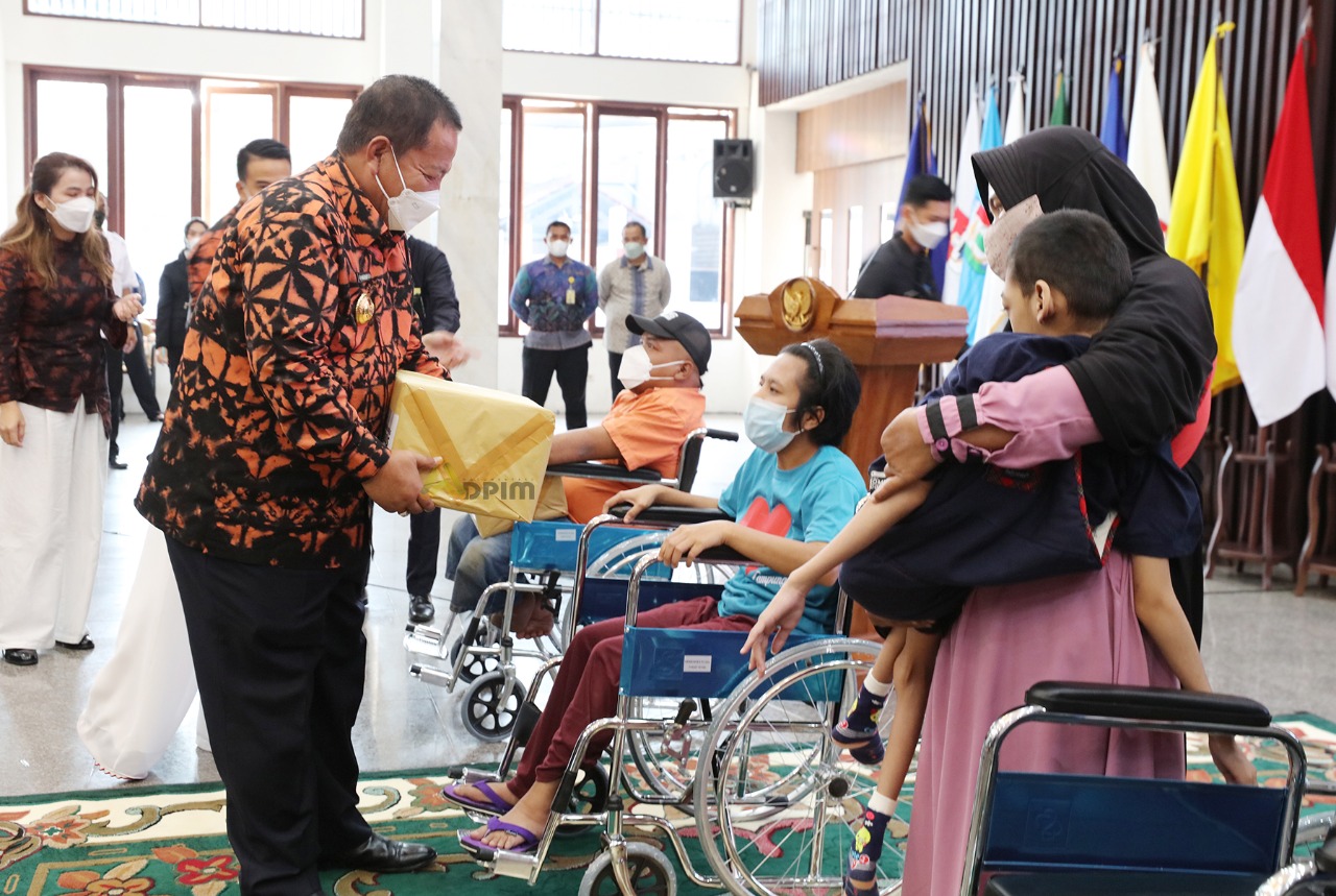 Selanjutnya, dilakukan penyerahan bantuan kursi roda untuk penyandang disabilitas dewasa dan anak-anak serta paket sembako sebagai wujud cinta kasih dari Gubernur Arinal bersama PKD Provinsi Lampung.*