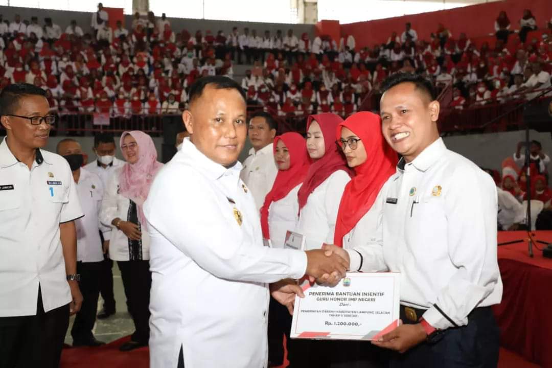 KALIANDA, LK – Pemerintah Kabupaten Lampung Selatan serahkan penyaluran bantuan insentif guru honor tahap II di lingkup Dinas Pendidikan Lampung Selatan yang bertempat di Gedung Olahraga Way Handak, Kamis 15 September 2022.
