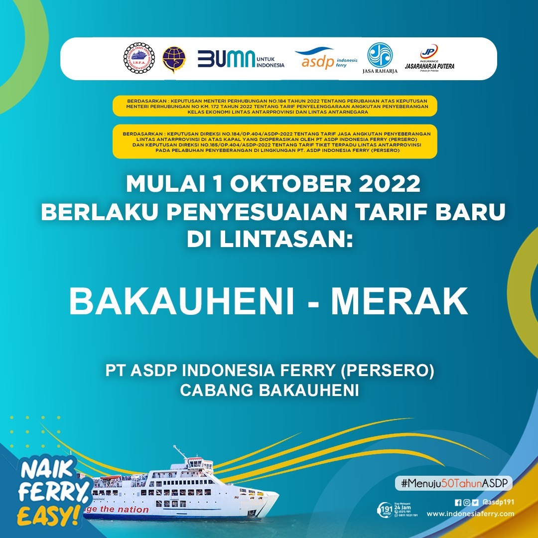 JAKARTA, LK — Mulai 1 Oktober 2022, PT ASDP Indonesia Ferry (Persero) akan menerapkan penyesuaian tarif baru di 53 lintasan penyeberangan di seluruh Indonesia. Hal ini mengacu kepada telah disahkannya Keputusan Menteri Perhubungan No 184 Tahun 2022 tentang Perubahan atas Keputusan Menteri Perhubungan No 172 Tahun 2022 tentang Tarif Penyelenggaraan Angkutan Penyeberangan Kelas Ekonomi Lintas Antarprovinsi dan Lintas Antarnegara.