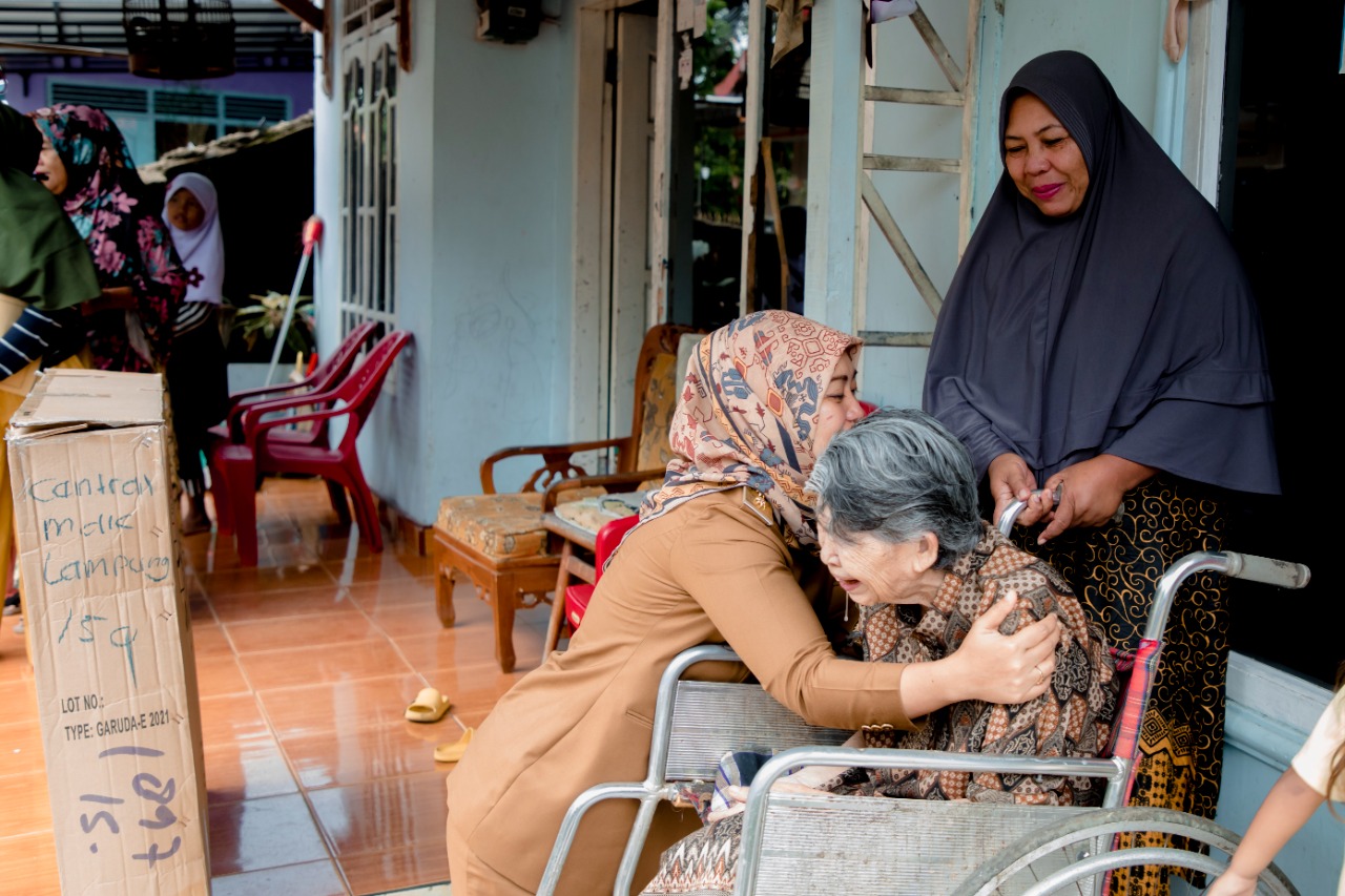 BANDARLAMPUNG, LK — Wakil Gubernur Lampung Chusnunia Chalim (Nunik) memberikan bantuan satu unit kursi roda sebagai bentuk kepedulian sosial Pemerintah, kepada Rusnaini (70) warga Kelurahan Sumber Rejo Sejahtera, Kecamatan Kemiling, Bandar Lampung, Selasa 8 November 2022.