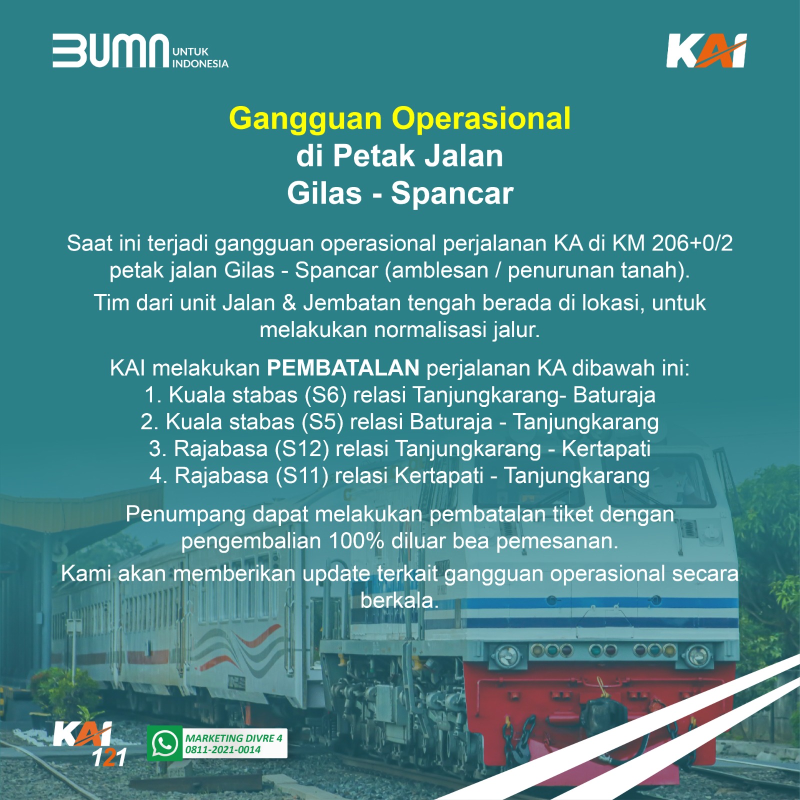 ” Para pelanggan yang terdampak telah kami informasikan seluruhnya terkait kondisi terbaru perjalanan KA-nya dan dapat melakukan pembatalan tiket dengan pengembalian 100% diluar bea pemesanan. Info selengkapnya terkait perjalanan KA, pelanggan dapat menghubungi Customer Service di Stasiun, Contact Center KAI melalui telepon di 021-121, WhatsApp KAI121 di 08111- 2111-121, email cs@kai.id, atau media sosial KAI121.” Jelasnya.