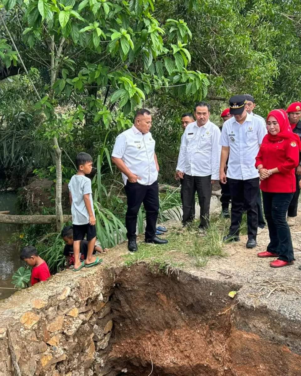 LAMPUNGKHAM.COM-Bupati Lampung Selatan H. Nanang Ermanto didampingi Dinas Pekerjaan Umum dan Perumahan Rakyat (PUPR) meninjau langsung jembatan longsor akibat tergerus hujan yang berada di Desa Sumberjaya Kecamatan Jati Agung, pada Rabu pagi 3 Mei 2023.