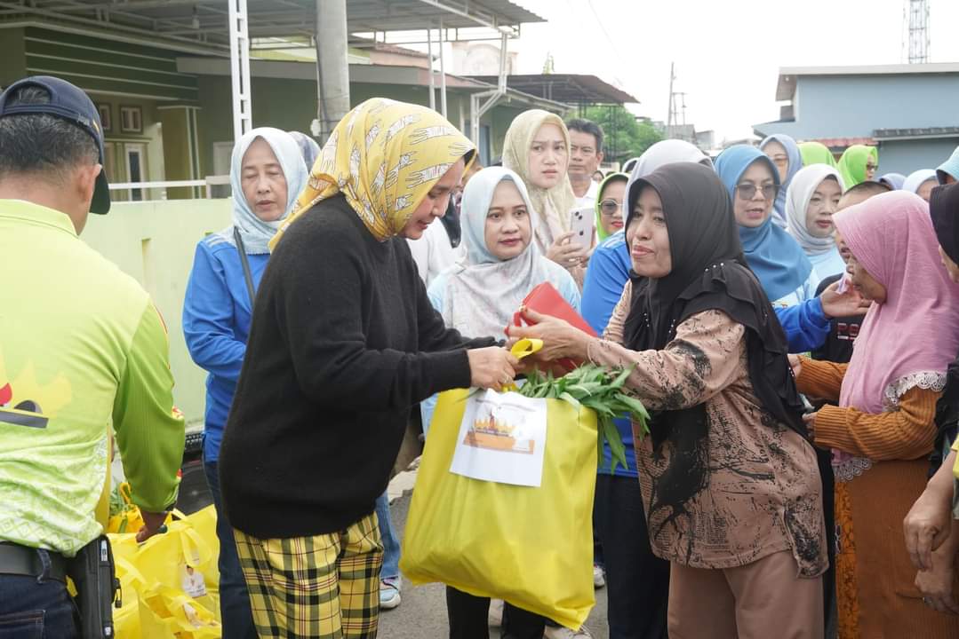 Ketua TP. PKK Provinsi Lampung Riana Sari Arinal bersama beberapa Organisasi Perangkat Daerah (OPD) di Lingkungan Pemerintah Provinsi Lampung, memberikan bantuan dalam program SIGER kepada masyarakat Kelurahan Negeri Olok Gading Teluk Betung Barat, Jumat 19 April 2024.