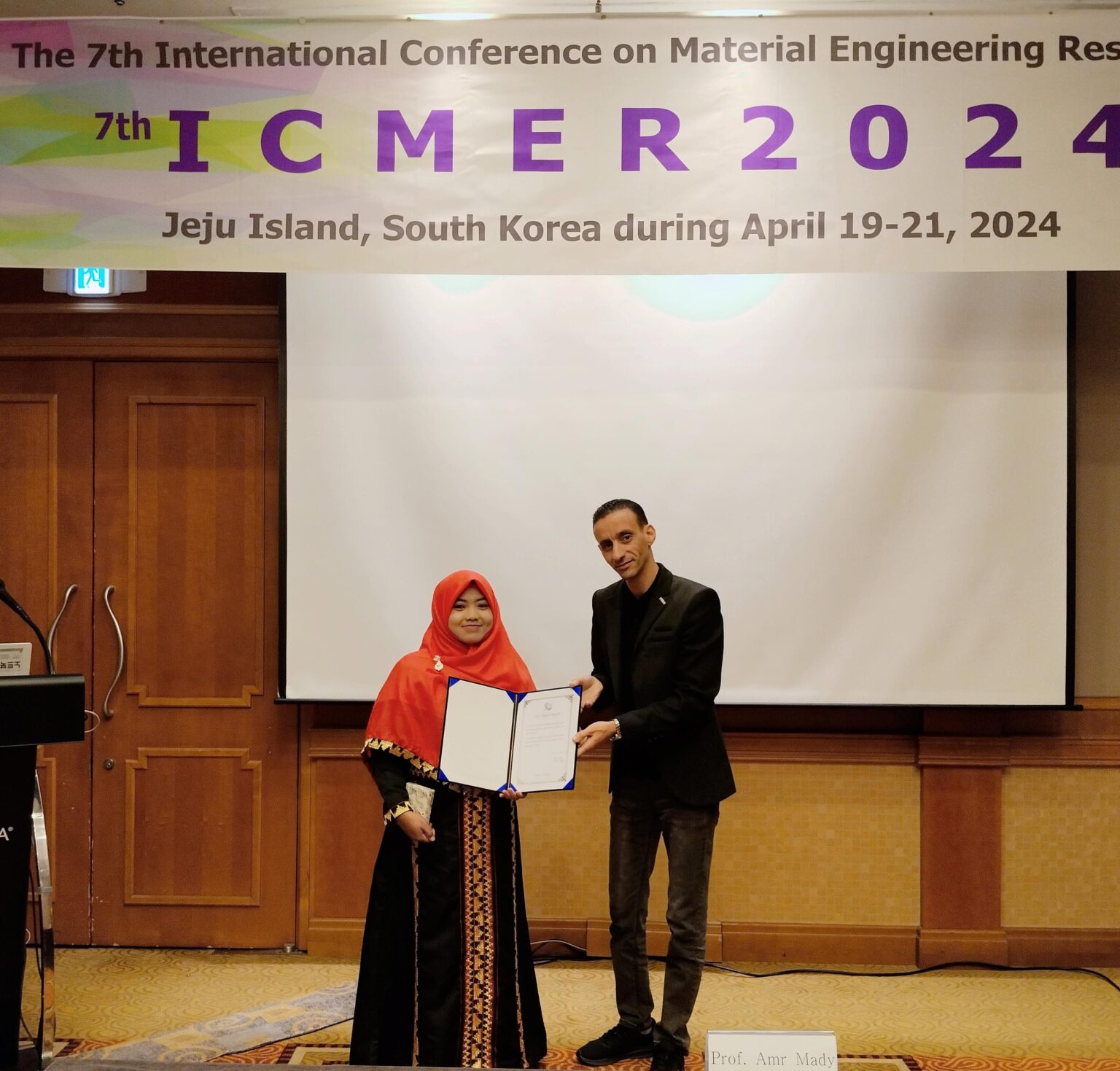 LAMPUNGKHAM.COM-Dosen Fakultas Matematika dan Ilmu Pengetahuan Alam (FMIPA) Universitas Lampung (Unila), Leni Rumiyanti S.Pd., M.Sc., berhasil meraih penghargaan “Best Oral Presentation” dalam acara “The 2024 7th International Conference on Material Engineering Research (ICMER 2024)”, pada 20 April 2024, di Pulau Jeju, Korea Selatan.