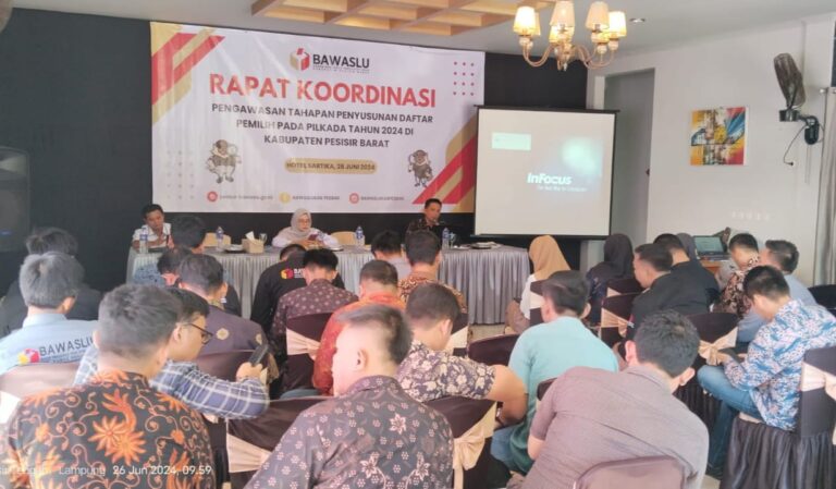 LAMPUNGKHAM.COM-Bawaslu Kabupaten Pesisir Barat (Pesibar) menggelar Rapat Koordinasi (Rakor) Pengawasan Tahapan Penyusunan Daftar Pemilih pada Pemilihan Kepala Daerah (Pilkada) Tahun 2024, Rabu, 26 Juni 2024.