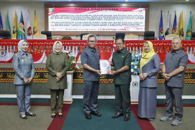 Sekretaris Daerah Provinsi Lampung Fahrizal Darminto dalam kesempatan tersebut menyerahkan Dokumen Rancangan Perubahan Kebijakan Umum APBD dan Prioritas Plafon Anggaran Sementara Tahun 2024 serta Dokumen Rancangan Kebijakan Umum APBD dan Prioritas Plafon Anggaran Sementara Tahun 2025 yang diterima secara langsung oleh Ketua DPRD Provinsi Lampung, Mingrum Gumay.