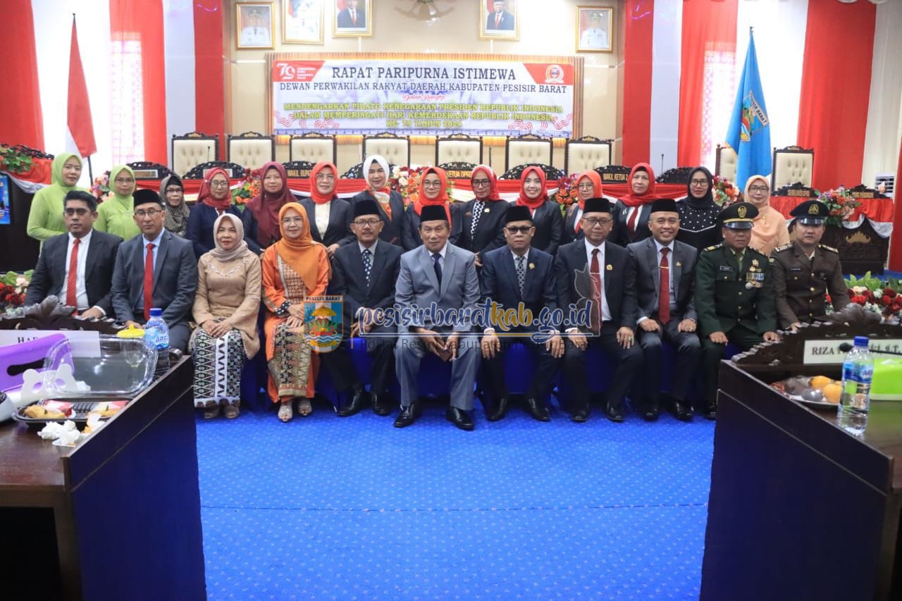 Bupati Pesisir Barat (Pesibar), Dr. Drs. Agus Istiqlal, S.H., M.H., menghadiri rapat paripurna istimewa Dewan Perwakilan Rakyat Daerah (DPRD) dengan agenda mendengarkan pidato kenegaraan Presiden Republik Indonesia (RI), Ir. Joko Widodo, di ruang rapat paripurna DPRD, Jumat 16 Agustus 2024.