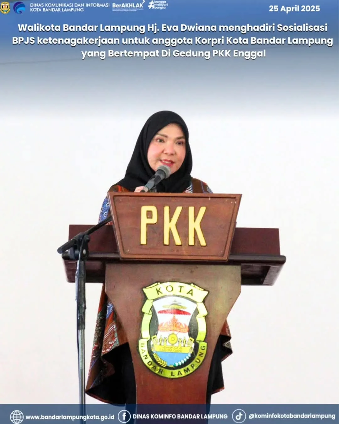 LAMPUNGKHAM.COM-Walikota Bandar Lampung, Hj. Eva Dwiana menghadiri Sosialisasi BPJS Ketenagakerjaan untuk anggota Korpri Kota Bandar Lampung yang bertempat di Gedung PKK Enggal. Jumat (25/04/2025).