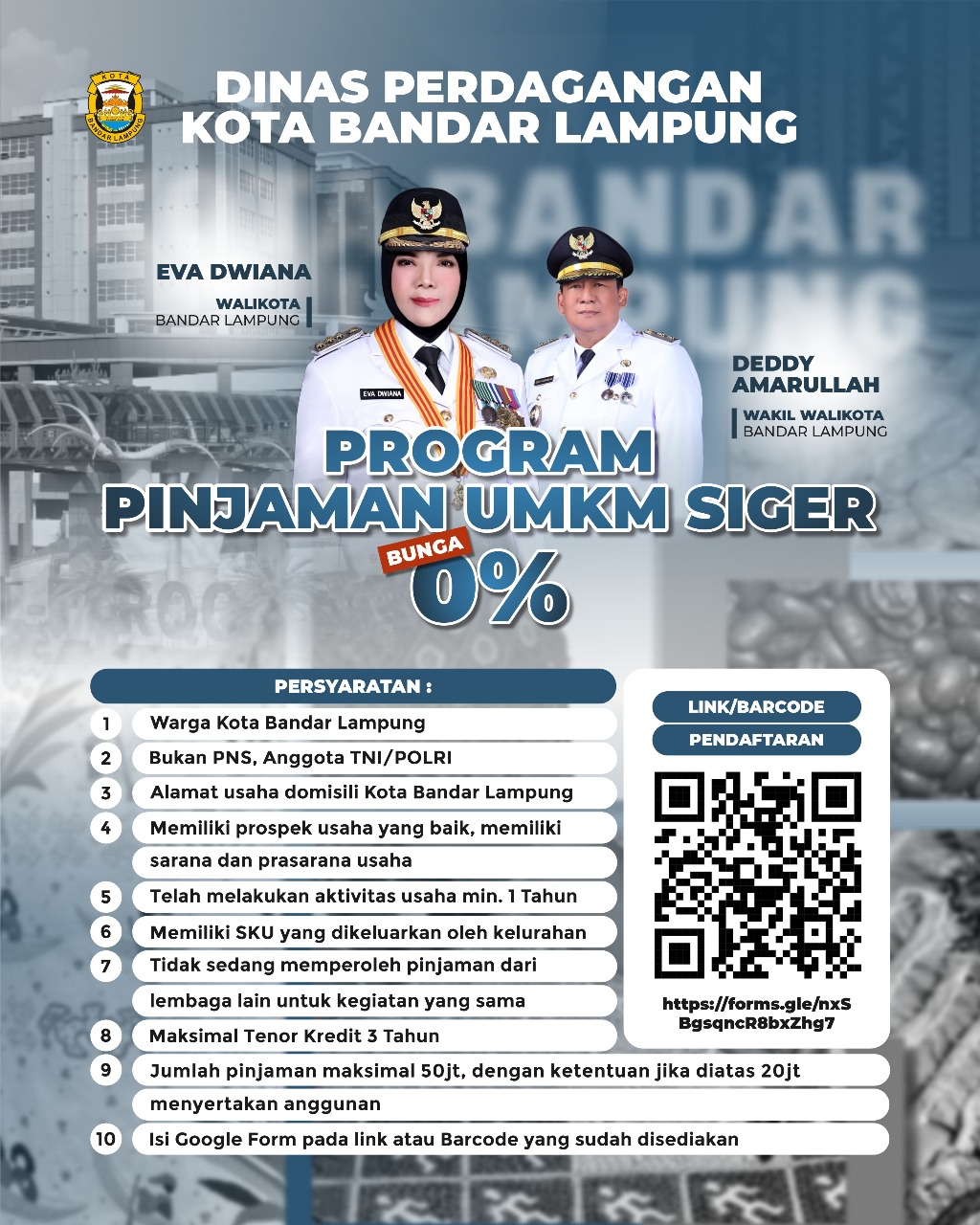 LAMPUNGKHAM.COM-Pemkot Bandarlampung melalui Dinas Perdagangan memberikan kemudahan dengan program pinjaman UMKM Siger bunga 0 persen.