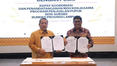 LAMPUNGKHAM.COM-Fasilitasi Petani Pengguna Kartu Petani Berjaya Dapatkan Pupuk, Gubenur Arinal Djunaidi Tandatangani Kesepakatan Bersama PT….