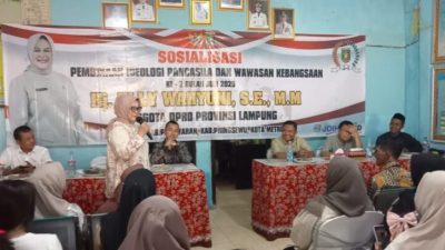 LAMPUNGKHAM.COM-Anggota DPRD Lampung, Elly Wahyuni, menyosialisasikan Pembinaan Ideologi Pancasila dan Wawasan Kebangsaan di Desa Gebang…